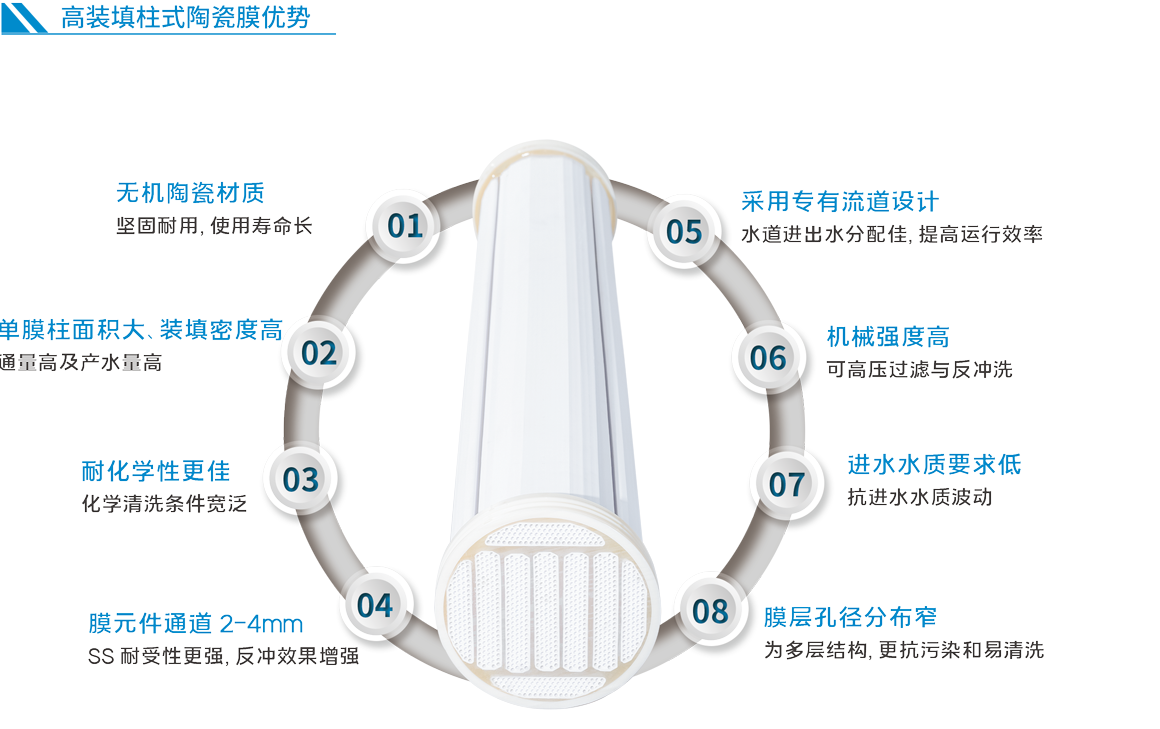 青青草网址高装填柱式青青草视频污是在青青草网址传统管式青青草视频污及平板式青青草视频污技术基础上研制出的一款用于水处理的无机超滤膜。高装填柱式青青草视频污是采用高强度α-Al2O3在高温下焙烧制成,拥有良好的耐高温性能,抗化学腐蚀性,优秀的机械强度。相对传统多通道管式青青草视频污,高装填柱式青青草视频污单支膜管过滤面积可达 10-25 ㎡,拥有更大的装填密度及处理能力,能够有效去除固体悬浮物、细菌以及胶体等物质,可应用于民用安全用水、市政给水和废水处理、应急供水、水回用、工业过程废水等多个领域。